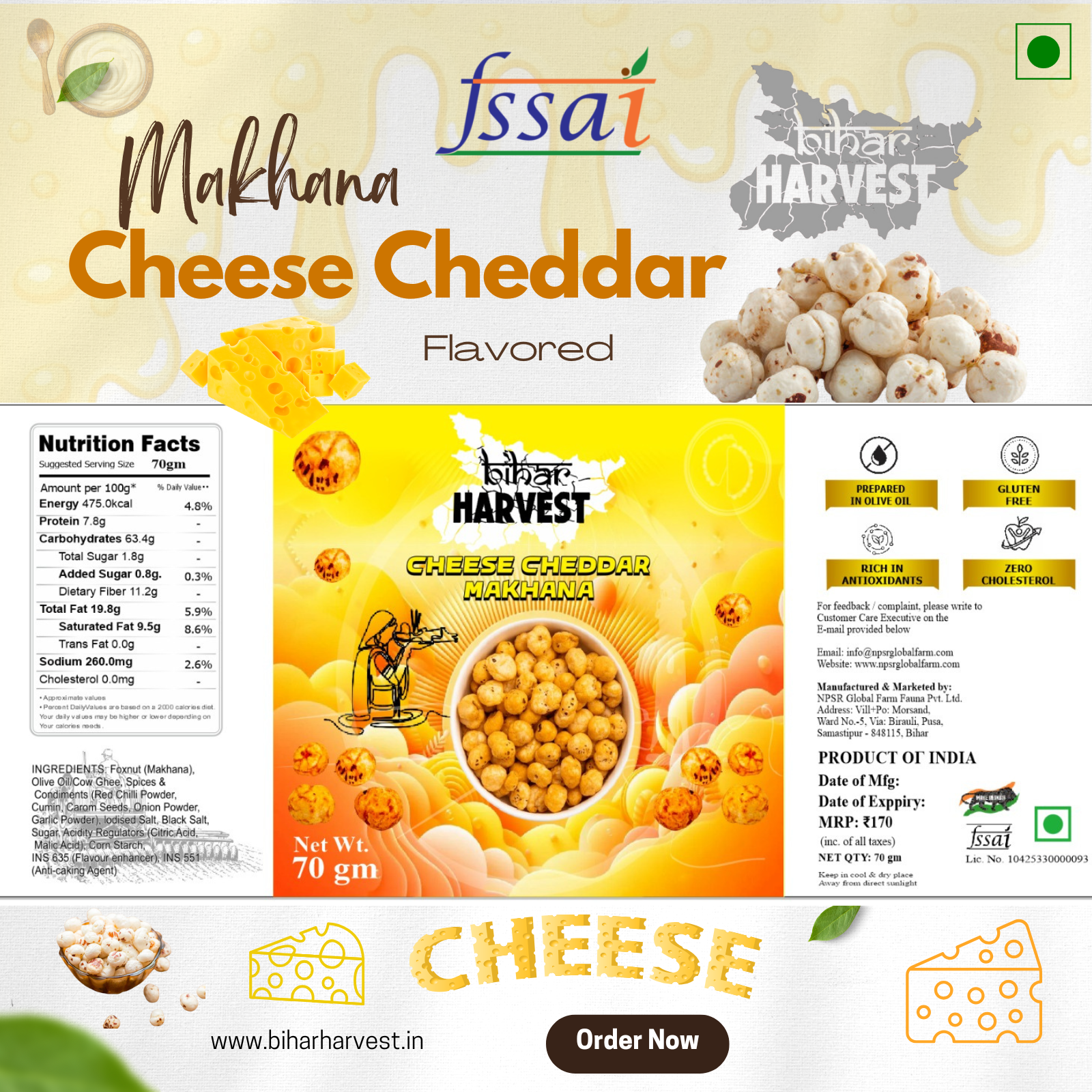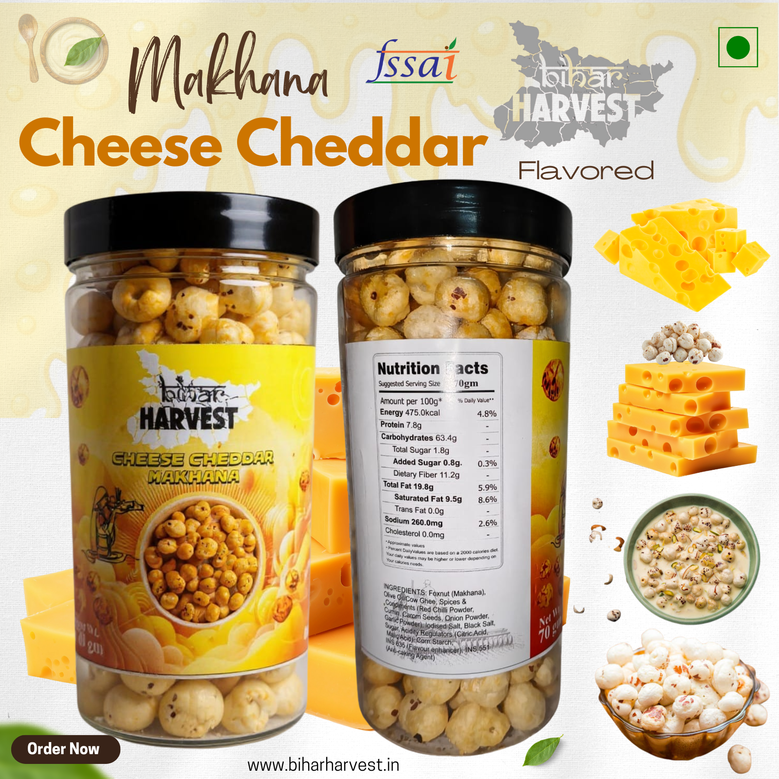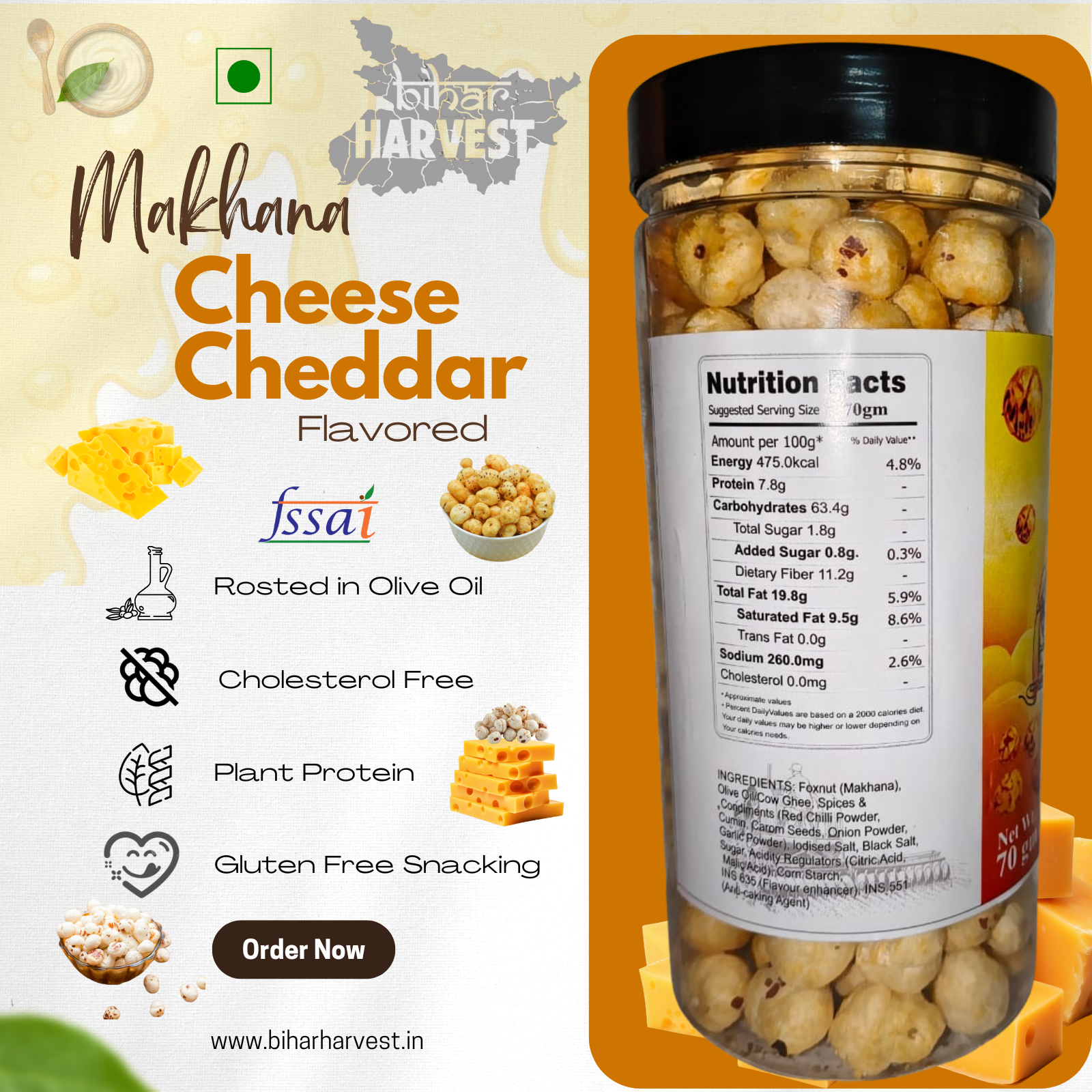 Bihar Harvest Makhana – Cheese Cheddar Flavor is a wholesome and delicious snack made from premium-quality foxnuts (makhana). Rich in protein, fiber, and essential nutrients, it supports weight management and overall wellness, making it a perfect guilt-free treat.